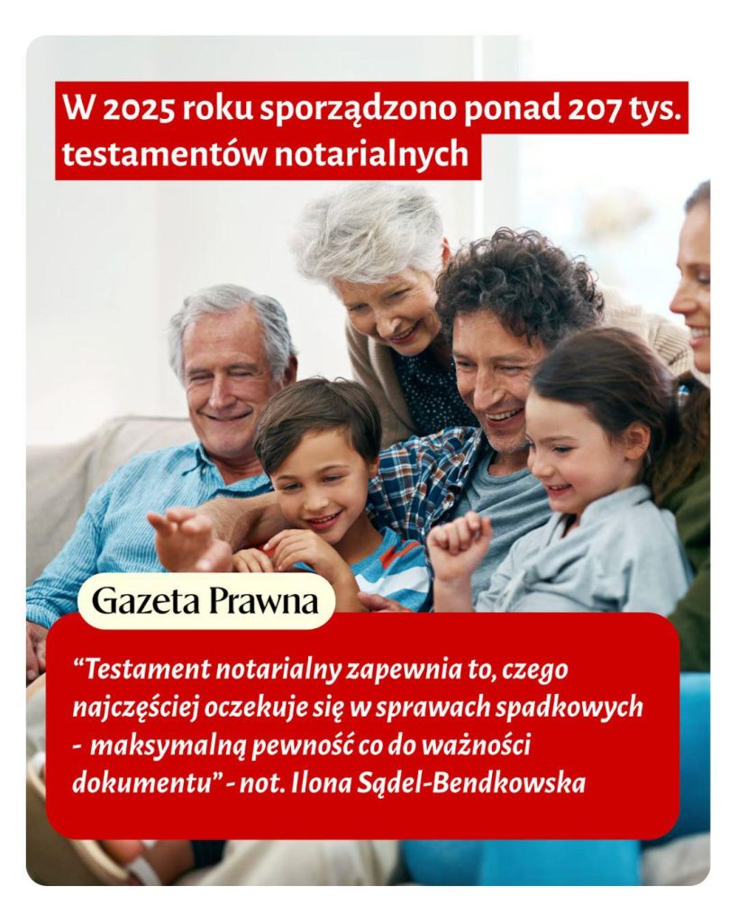 „Testament notarialny zapewnia to, czego najczęściej oczekuje się w sprawach spadkowych: najwyższy poziom pewności co do ważności dokumentu, jego bezpieczeństwa oraz możliwości skutecznej realizacji ostatniej woli spadkodawcy. To rozwiązanie, które w sposób realny i trwały wzmacnia bezpieczeństwo prawne oraz chroni interesy najbliższych”.